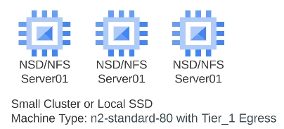 Using a storage type of Local SSD a single Google VM can read up to 9GB/s which requires at least 75Gbit egress tier-1 networking to reach full performance. This type of networking comes in machine types with a large amount of memory and a large number of vCPU cores. In this case the NFS server can utilize the additional memory and cores, optimizing the deployment for cost performance. When running an NFS server on the same VM as an NSD server, some of the VM network bandwidth is consumed by NSD server traffic in addition to the NFS client traffic. This is fine if the resulting NFS client bandwidth meets your requirements, so consider this when choosing a machine and storage types.